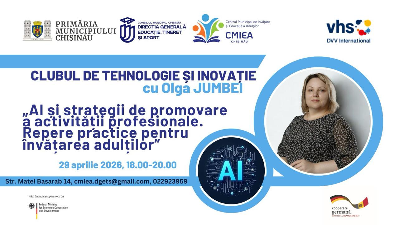 Evenimentul va avea loc miercuri, 29 aprilie 2026, între orele 18:00 și 20:00, la Centrul Municipal de Învățare și Educație a Adulților, situat pe strada Matei Basarab 14. Sesiunea va aborda tema „Instrumente AI și strategii de promovare a activității profesionale”, într-un context în care digitalizarea și inteligența artificială influențează tot mai mult modul în care oamenii învață, muncesc și comunică.