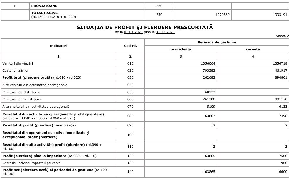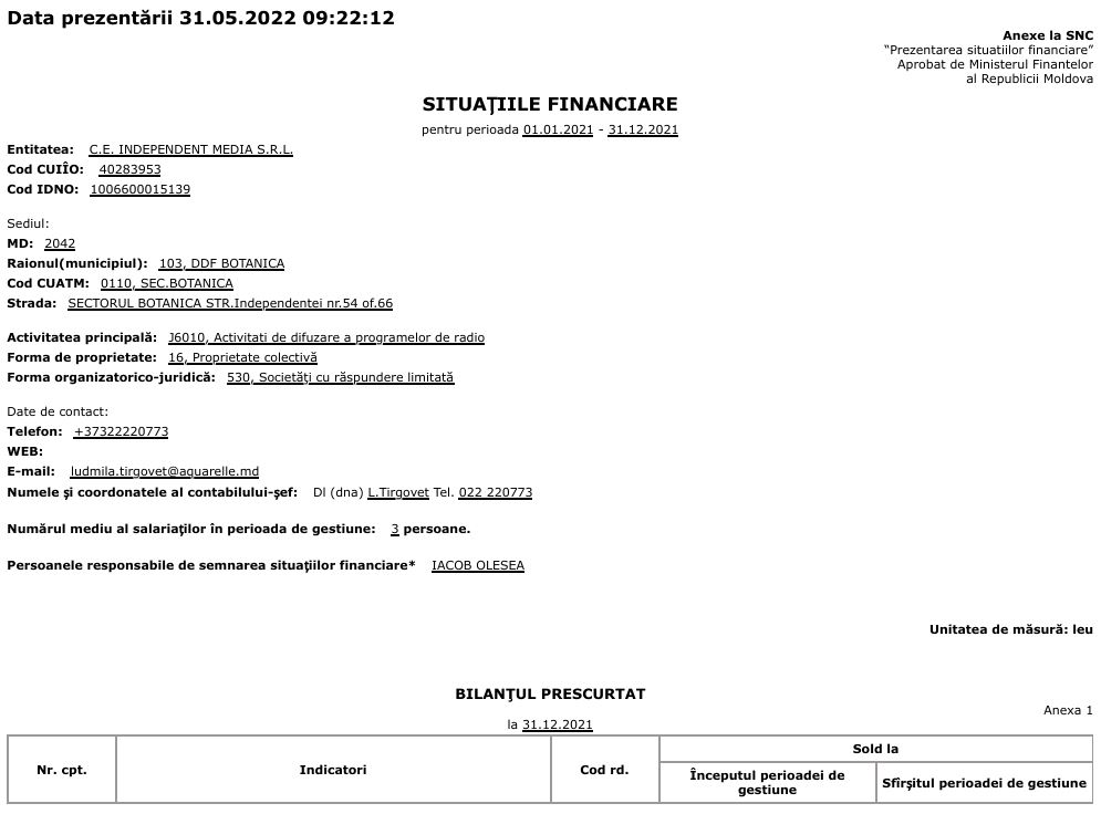 Raport financiar al CE “Independent Media” SRL pentru anul 2021