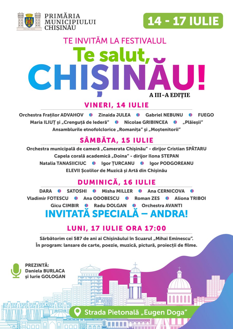 Iar luni, 17 iulie, de la ora 17:00, sărbătorim cei 587 de ani ai Chișinăului în Scuarul „Mihai Eminescu”. În program: lansare de carte, poezie, muzică, pictură, proiecții de filme.